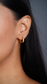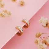 Golden Arc is a pair of gold-tone hoop earrings with a sleek and minimalist design. The hoops are thin and have a hinge closure, making them easy to wear. A row of sparkling clear stones is embedded along the front of each hoop, adding a subtle touch of glamour. These earrings are versatile and can be dressed up or down, making them suitable for everyday wear or special occasions.