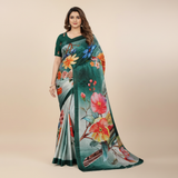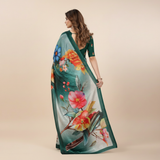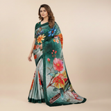 Enchanted Emerald Chiffon Silk Saree with Vivid Botanical Digital Print